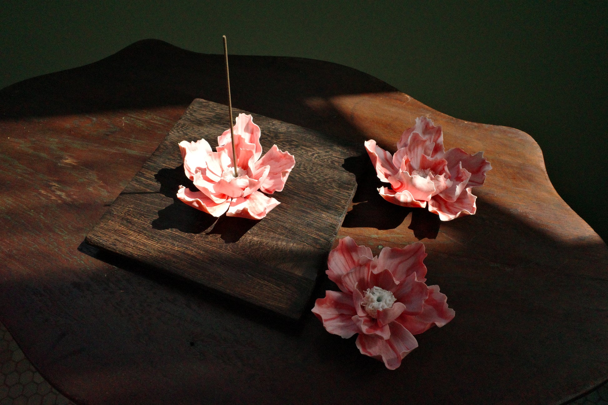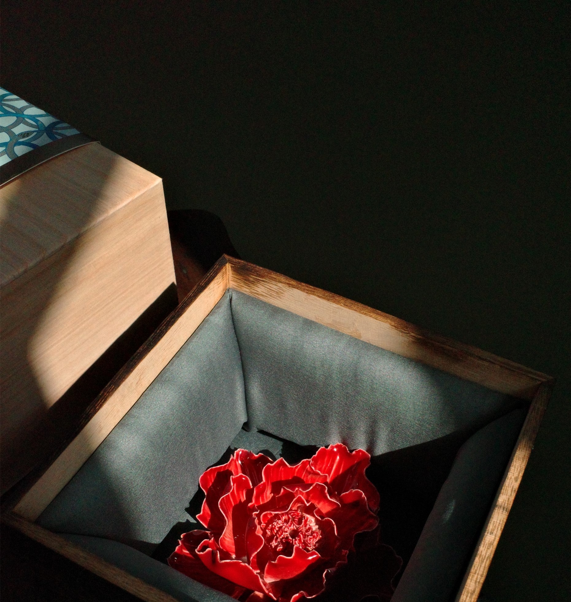 The set includes the "Blooming Prosperity" porcelain peony, paired with non-heritage sandalwood incense sticks, allowing the floral beauty to be accompanied by a serene fragrance. This combination invites you to "admire the art, savor the scent, and journey with light."
