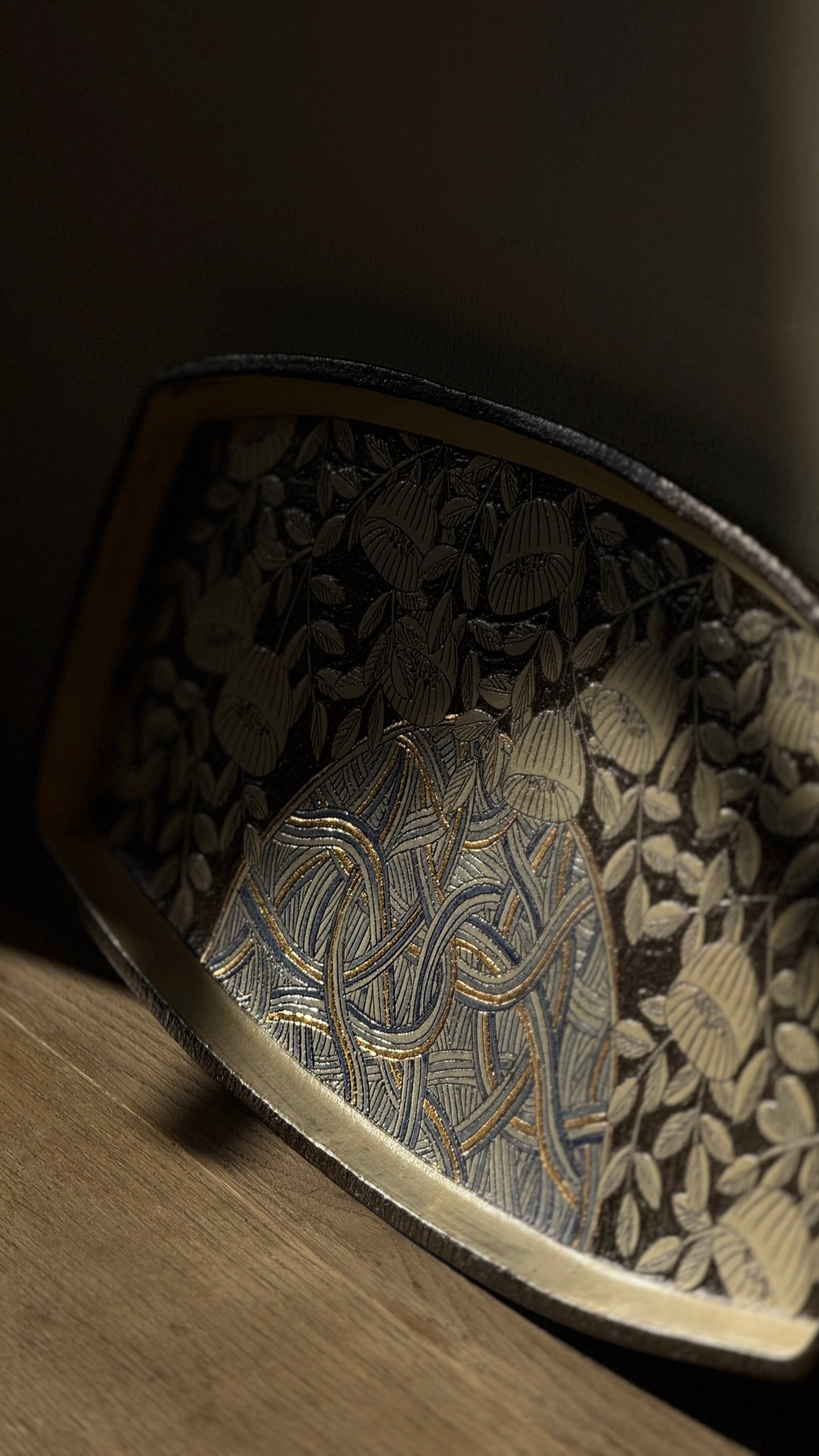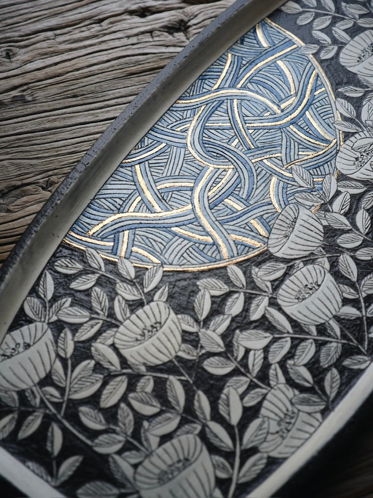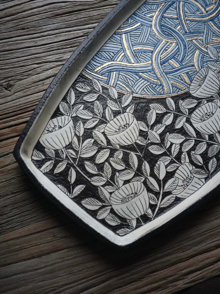 - Materials: British black clay, blue underglaze, gold detailing