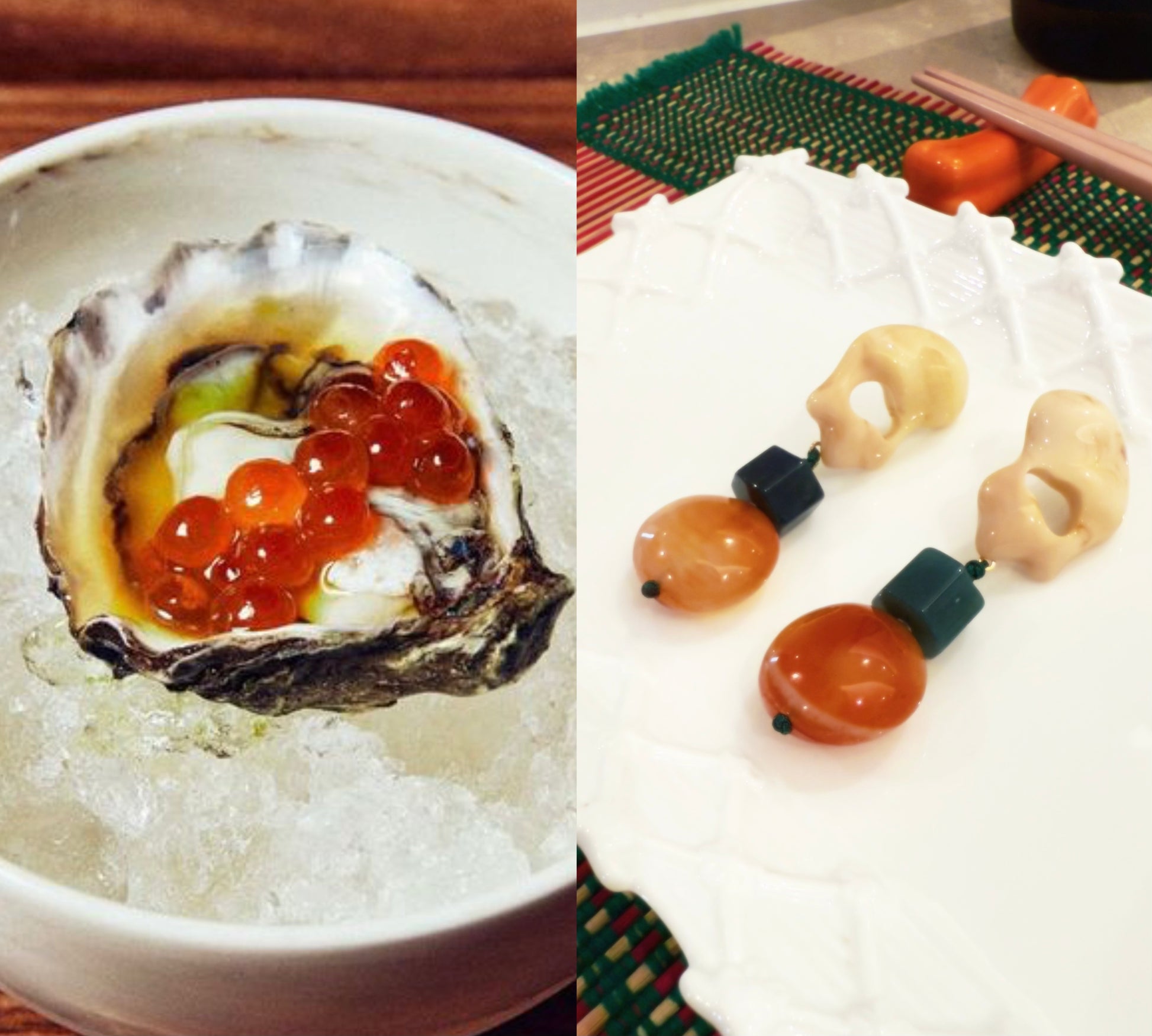 Inspired by the subtle art of what we eat, the collection Beneath The Chopsticks began with a stone — an onyx, soft pink-orange with creamy white bands. It looked uncannily like salmon sashimi. Beside it, another: deeper pink, delicate and rich — like toro. That moment sparked a craving not just for flavor, but for a story told in minerals. I began searching for textures of wasabi, glints of soy glaze, and the cool luster of oyster flesh.
