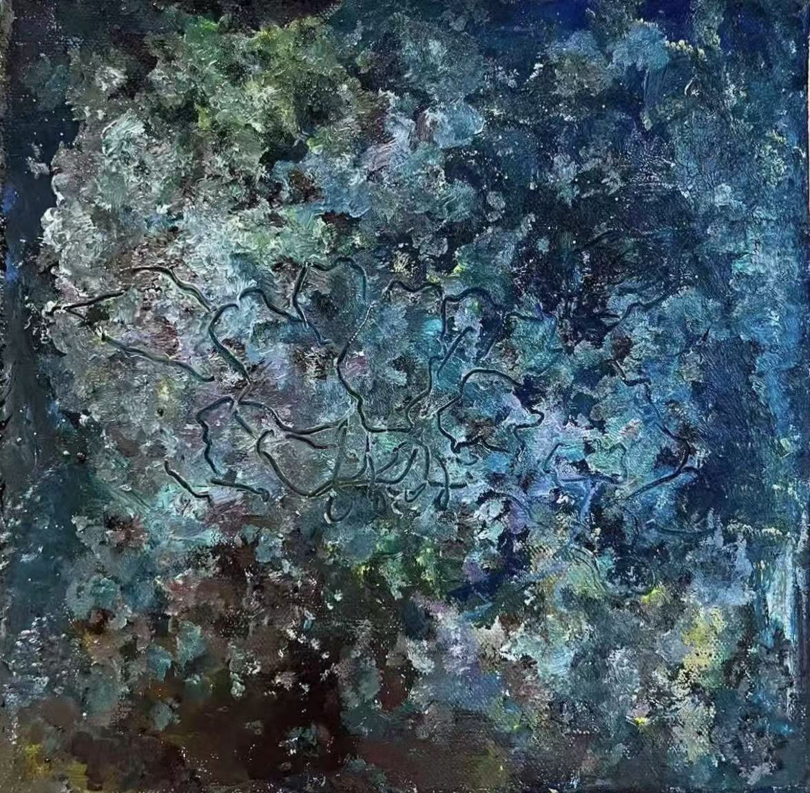 A richly layered abstract expression evoking the shimmering depth of a cosmic vista. “Galactic Process” captures the silent dynamism and romantic stillness of the universe’s edge—where starlight flickers and time seems to expand. A touch of romance in stillness adorns the edges of the galaxy.